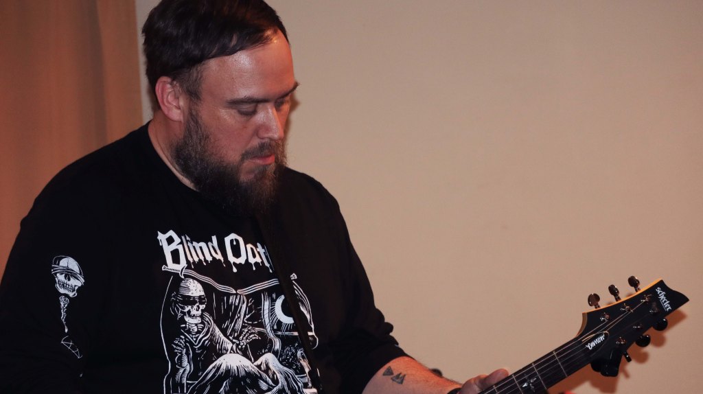 Each member of Measureless Aeons has a storied history of playing music, with each member more or less starting in their teens and exploring various genres. Brian and Ansley, both settled into their 40s, are what I (and probably most people) would consider true oldheads, evidenced by Ansley’s hxc shoulder tattoo and the number of past projects Brian’s been in (and current, with Brian serving as drummer in Evil Engines, another Jackson-based band), as well as the fact that Brian’s son Josh serves as the drummer for Starkville outfit Sludgelung, which I found to be absolutely precious. Even Ethan, a fresh-faced 26-year-old, plays his guitar as if it’s in his nature.