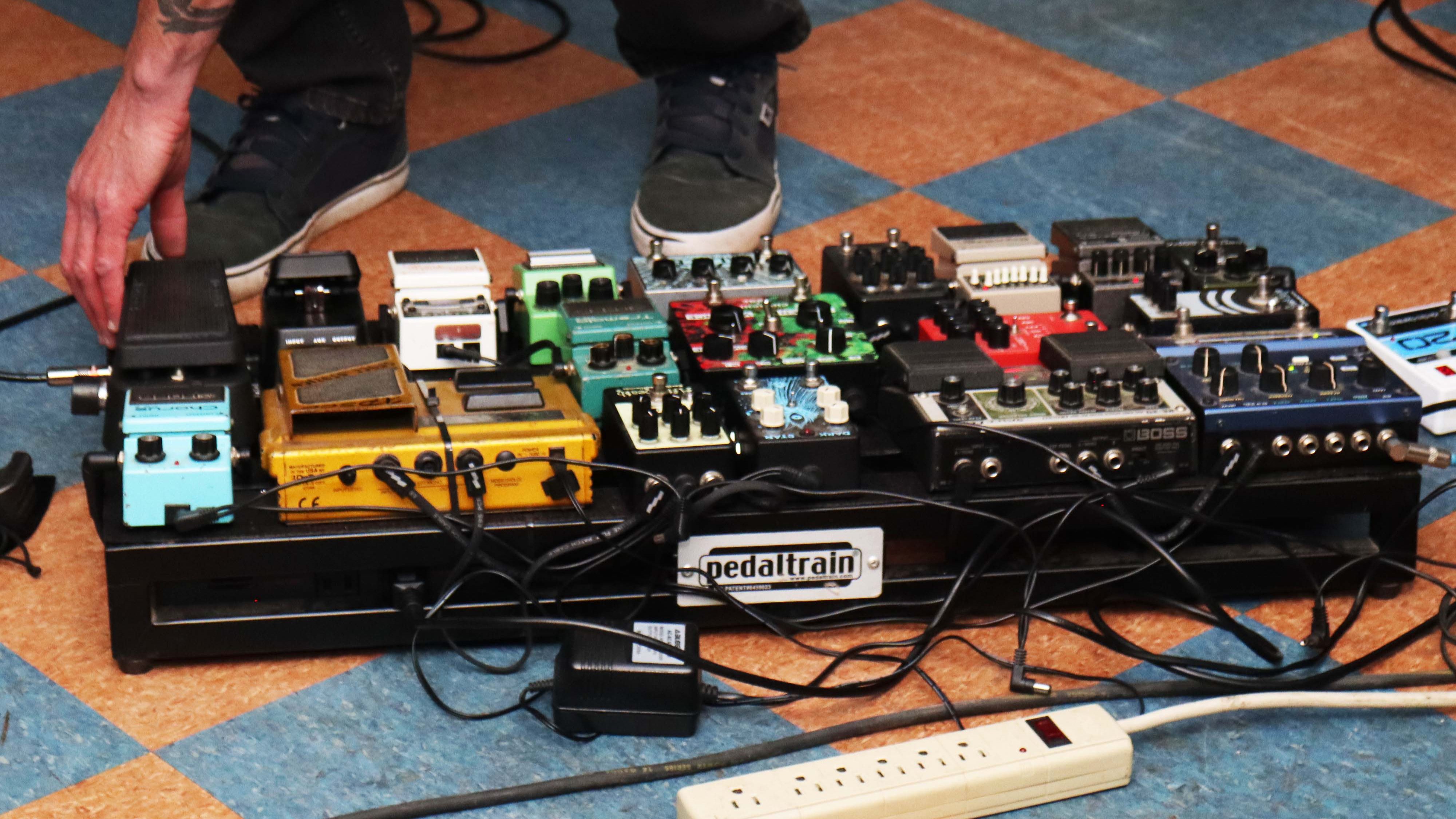 “You can always get by with the reverb and the distortion and delay,” Palmer said, “but I like to stack the sounds on top of each other.” Also, you have to keep in mind that not every pedal is activated at the same time–some pedals are used only for certain sections of certain songs. Still, with that many effects layered at once, Palmer’s guitar can sound almost synth-like in certain parts.